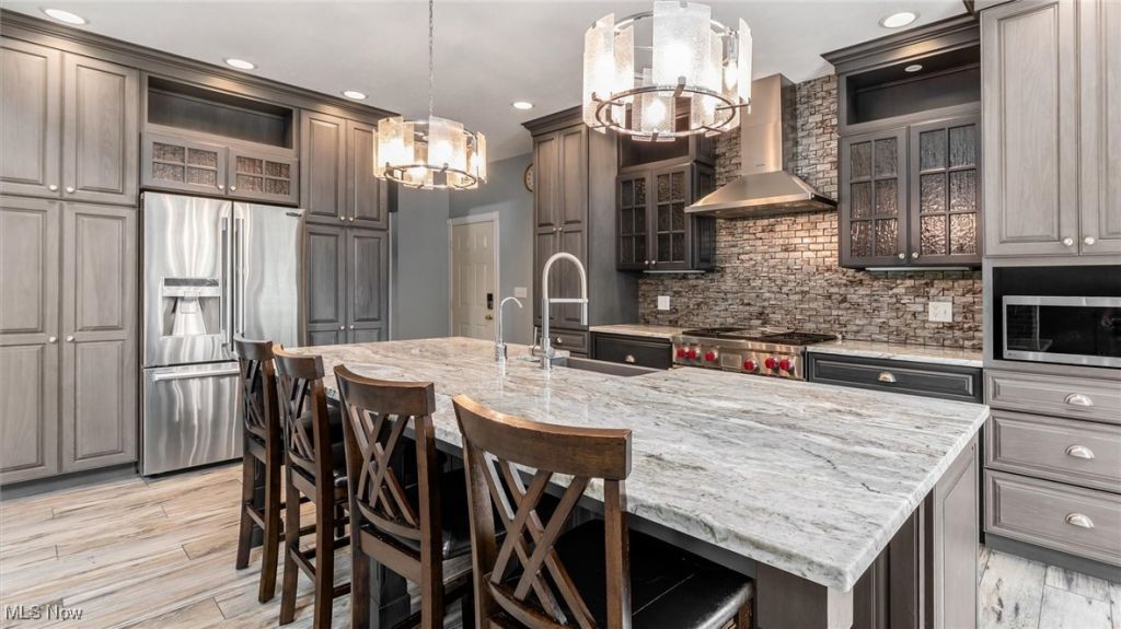 FABULOUS NEW PRICE along with a flooring allowance. Step into luxury with this beautiful, two-story brick home located in the Maple Creek subdivision. This home offers over 4,700 sq ft of finished living space including the fully finished lower level. Inside you will discover soaring ceilings, an open -concept layout, and an abundance of natural light.The main level features a grand foyer with a magnificent open staircase to the upper level. There is a room off of the foyer that would make a great office. The dining room is open to the foyer and is very spacious. Between the dining room and kitchen you have a back staircase to the upper level.The gourmet kitchen has recently been updated with premium appliances, quartz countertops, and a spacious island. The kitchen features a cozy nook for informal eating.The kitchen flows right into the family room that features a gas fireplace. You can access the large deck that overlooks the rear of the home from the family room.From the deck you can enter the other end of the home through a glass sun room into a possible 5th bedroom that has a full bathroom.Upstairs you will find a split floor plan of bedrooms for additional privacy.The primary en suite is very spacious, with large windows, a gas fireplace and a walk in closet. The bathroom has been recently updated with a dual vanity,heated floors, lighting, a stand alone tub and a custom shower.The laundry room is conveniently located on this level. You have a second bedroom suite with a private bathroom. There are two spacious bedrooms that share a full bathroom. The finished walk out basement features a second family room with a gas fireplace, a full kitchen, a full bathroom with a walk in shower, a finished room with windows and a large storage area. Walk from the basement to a patio with a fire pit and a covered structure that would be perfect for entertaining.The back yard would offer plenty of room for outside activities or pool.This home has a 3 car garage.