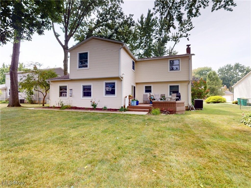 Welcome to this stunning Colonial located in the highly desirable Pinegate community in Mentor. This spacious and well-maintained home offers a perfect blend of character, modern updates, and thoughtful design. Step into the large remodeled family room, featuring a cozy gas fireplace, elegant oak wood trim, custom built-in bookcases, and soaring cathedral ceilings. Beautiful Andersen windows provide natural light and views of the lush backyard. The adjacent kitchen boasts tall oak cabinetry, a stained glass cabinet front, granite countertops, a designer tile backsplash, extra-deep sink with backyard views, and a charming coffee station. The first floor also features an updated half bath, a formal dining room with luxury vinyl plank flooring, and a carpeted living room with a large bay window for added natural light. Upstairs, the oversized primary suite includes a private office or library nook, a spa-style bathroom with a deep Jacuzzi tub, separate shower, large vanity, and a stunning walk-in closet with additional storage. Three more generously sized bedrooms, all with ample closet space, and a full bath complete the second floor. Designer blinds are featured throughout the home. Off the garage, you'll find a spacious laundry/mudroom with washer/dryer, laundry tub, cabinetry, and a walk-in pantry. The partially finished basement has been professionally waterproofed by Ohio Waterproofing with a lifetime warranty, includes a sump pump, and features a brand-new furnace and A/C (2024) and humidifier. Enjoy the beautifully landscaped, wooded backyard from your large deck, a peaceful retreat surrounded by nature. The five mature white oak trees along the side of the property are not only striking but hold significant monetary value. Additional features include a 2-car attached garage, ample storage throughout, and access to Pinegate amenities. This is must see Mentor gem.